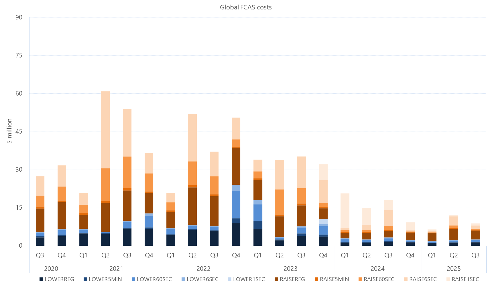 Bar chart of Quarterly global FCAS costs by services, as described above. See the CSV below for data.