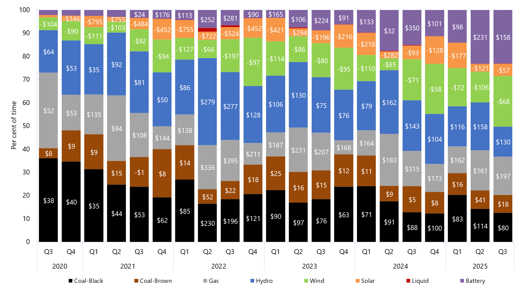 This figure shows the percentage of time generators of each fuel type set price in South Australia in a given quarter, for the past five years. The data labels show the quarterly average price set by generators of major fuel-types, in $/MWh.