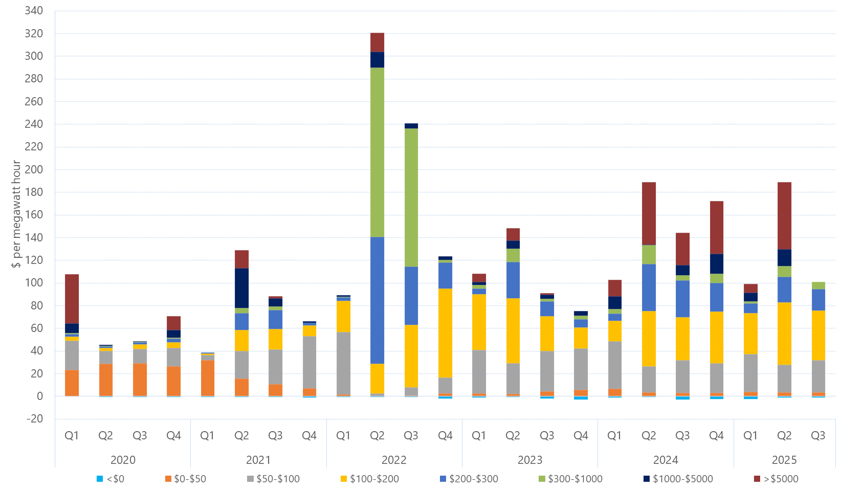 This figure shows the contribution of spot price in various price bands to the quarterly volume weighted average price in New South Wales for the past five years. The data tab contains data since 2006.