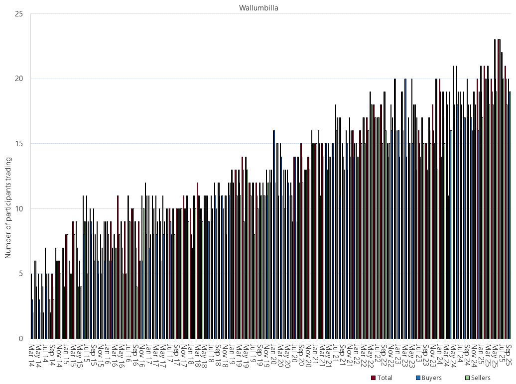 Bar chart of Wallumbilla Gas Supply Hub, monthly trade activity by participant, as described above. See the CSV below for data.